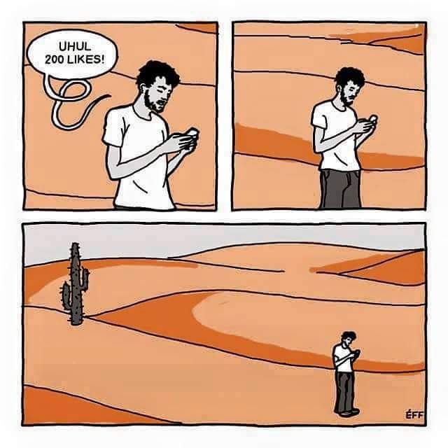 Achei essa imagem muito interessante. Ela traduz com exatidão a atual situação do ser humano, todos nós. Cada um em seu deserto, seu mundinho, publicando tudo nas redes sociais, e em compensação, completamente isolado por fora.